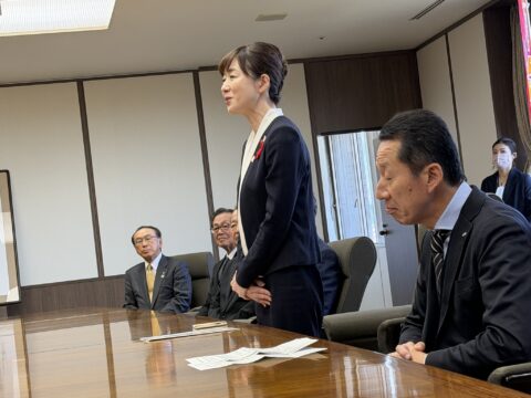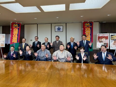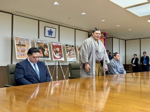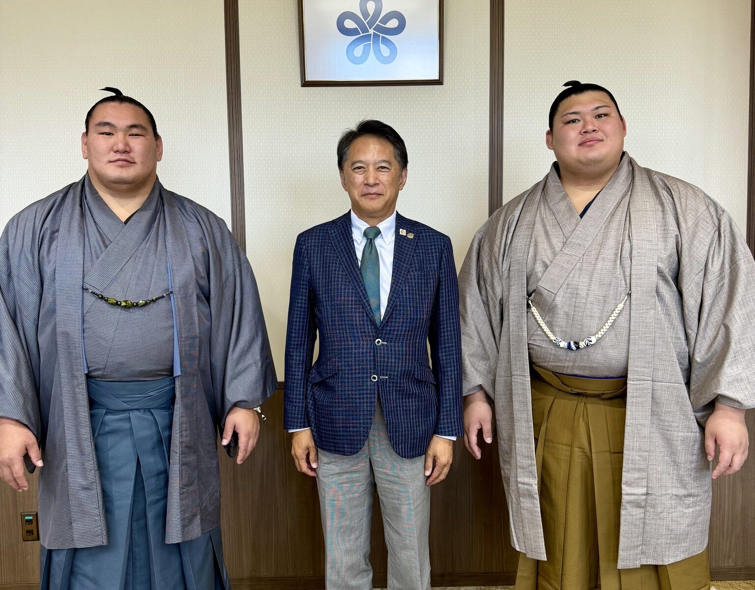 11月9日(土)から福岡国際センターで初日を迎える大相撲九州場所のPRのため、第75代横綱・大の里関と第74代横綱・豊昇龍関、そして九州場所担当部長の浅香山親方(元大関魁皇)が、福岡県庁にお越しくださいました。