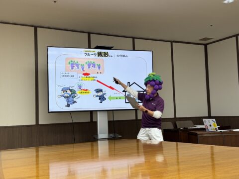 そして、地域活性化賞を受賞された、手島園の手嶋 洋司さん!農産物盗難対策のGPSタグ「フルーツ銭形君」を提案されましたが、何よりもブドウの被り物をして登場された手嶋さんのユニークな姿には、本当に度肝を抜かれました!