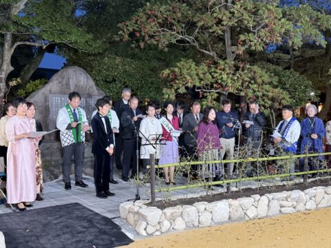 午後5時30分から白秋詩碑苑で行われた開会式では、江口副知事、松永柳川市長をはじめ、多くの来賓・関係者の皆様とともに、北原白秋ゆかりの名曲「砂山」と「帰去来」を合唱。夕暮れの詩碑苑に響く旋律は、白秋が愛した故郷・柳川の情景と重なり、心に深く残る瞬間となりました。