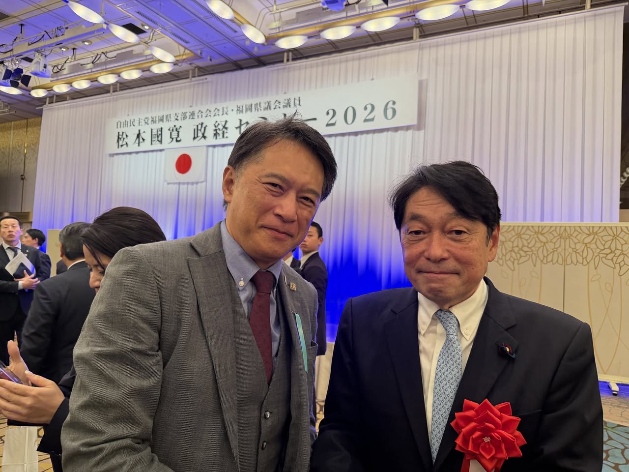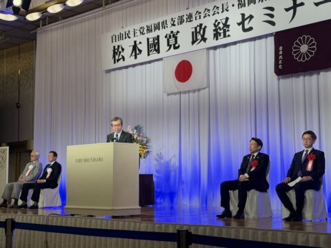 3月8日、松本先生のご就任を記念する「松本國寛政経セミナー2026」が発起人代表の麻生太郎副総裁や蔵内勇夫県議会議長、御来賓に服部誠太郎福岡県知事、松尾統章自民党県議団会長、多数の国会議員や県内の首長、各界の代表者をお迎えし盛大に開催されました。