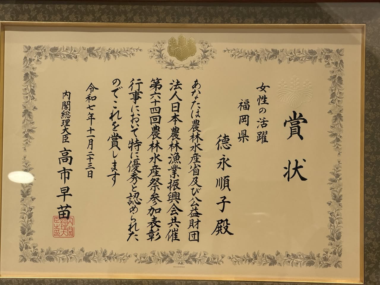 日本初の女性総理「高市早苗」さんの名前で賞状が贈られたのも感慨深いです。改めて、内閣総理大臣賞受賞、本当におめでとうございます! 🎊🌾